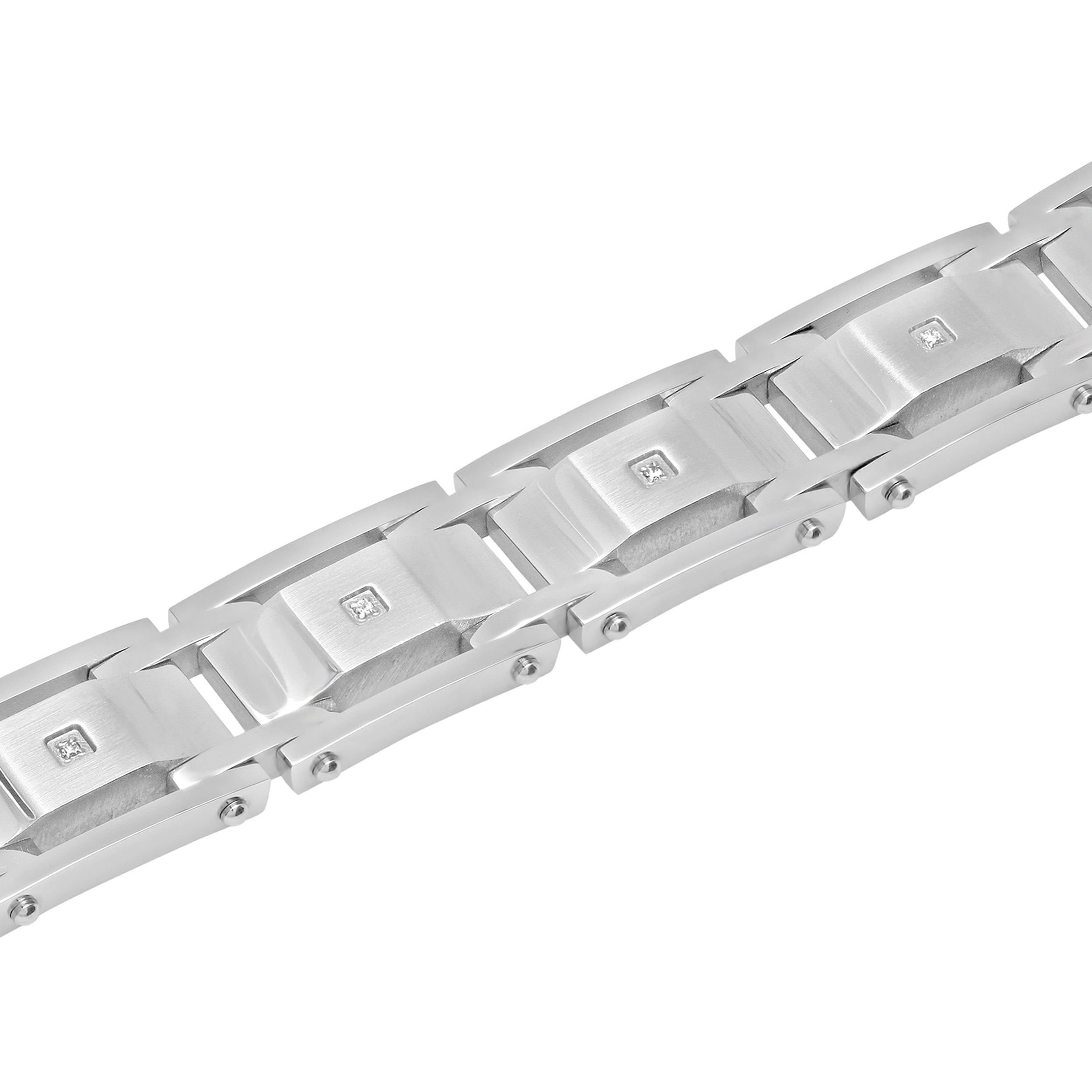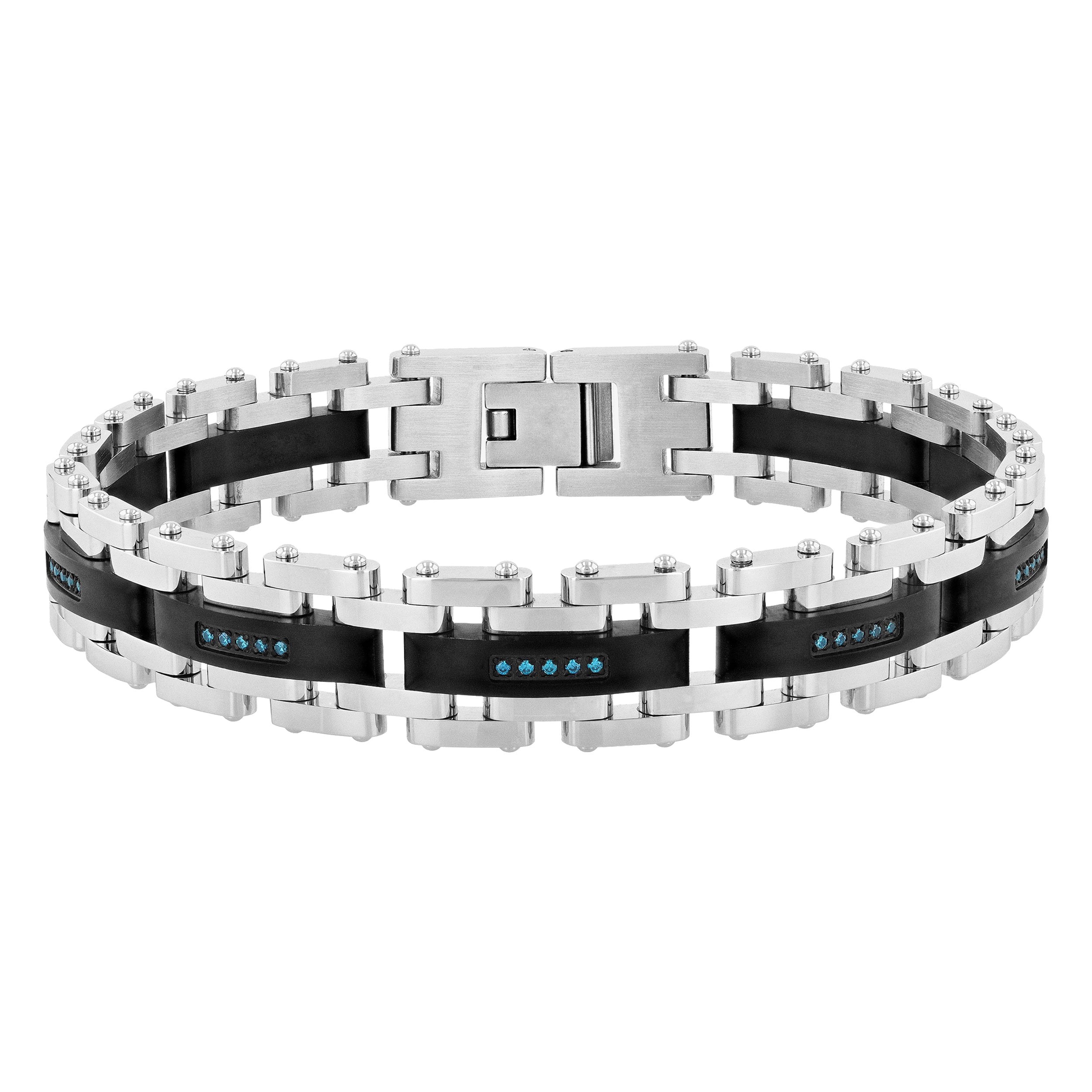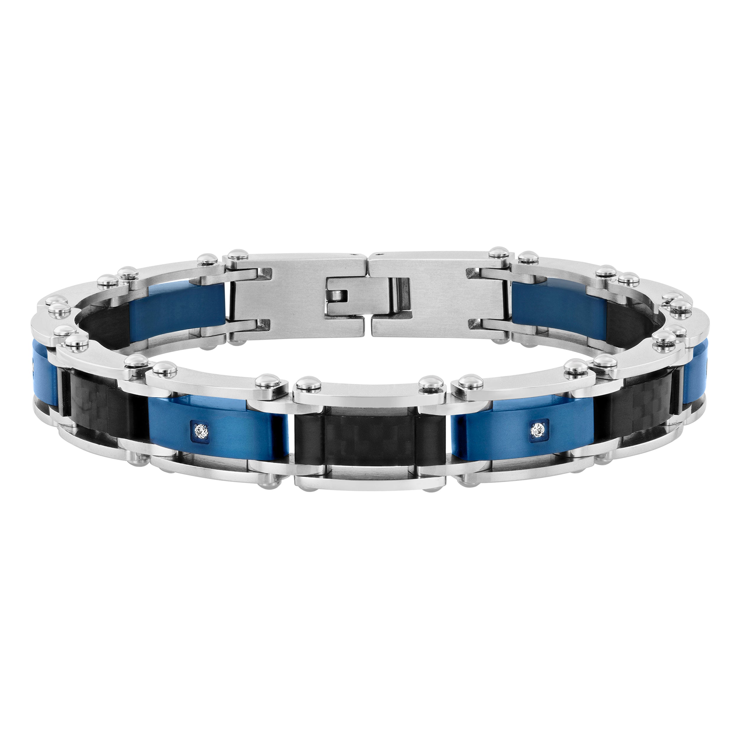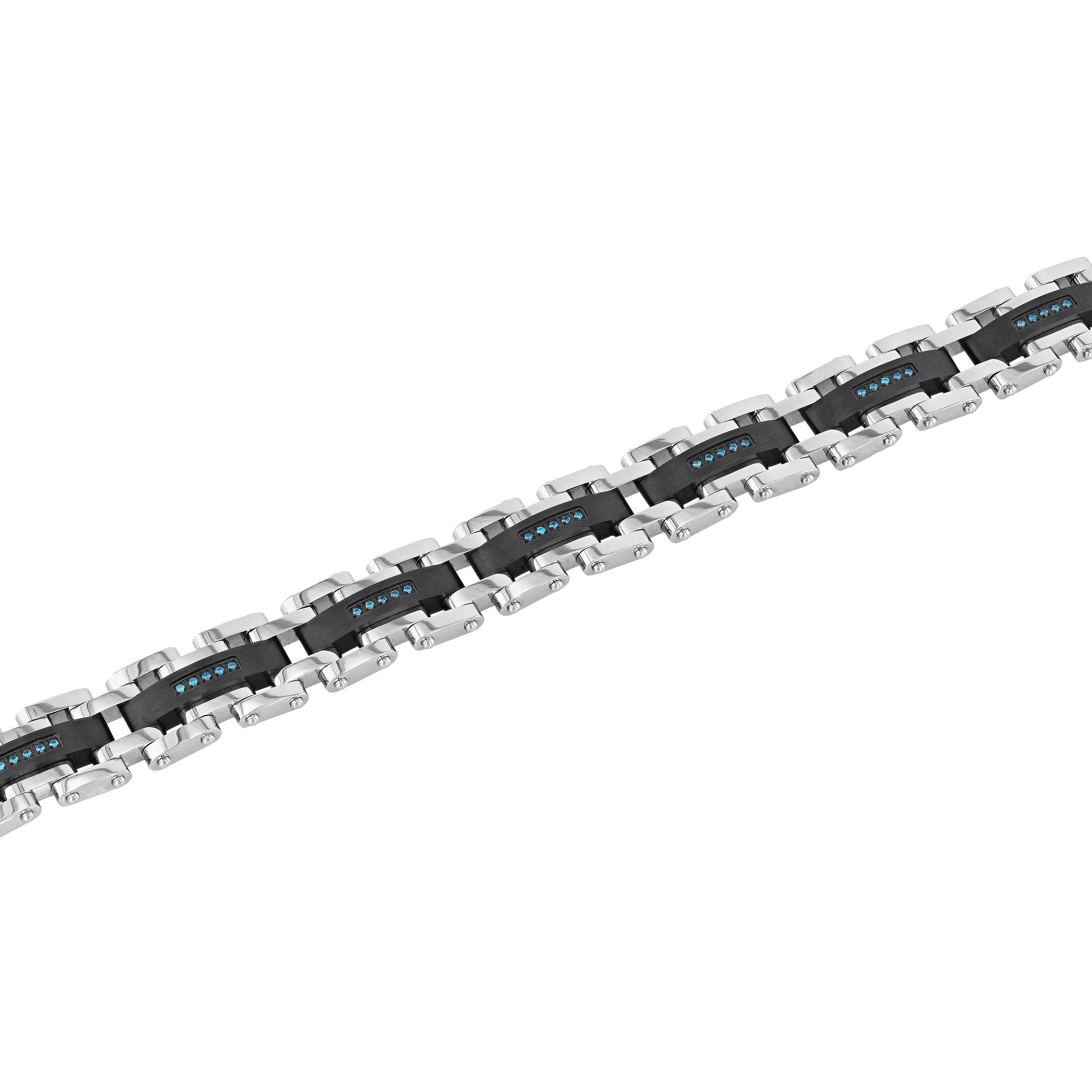 A durable men’s bracelet with a clean, geometric link design and carbon fiber inlays. Crafted from 100% stainless steel and set with .07 carat total weight of round-cut diamonds for subtle shine. Available with blue or yellow accents for a sporty, engineered feel.