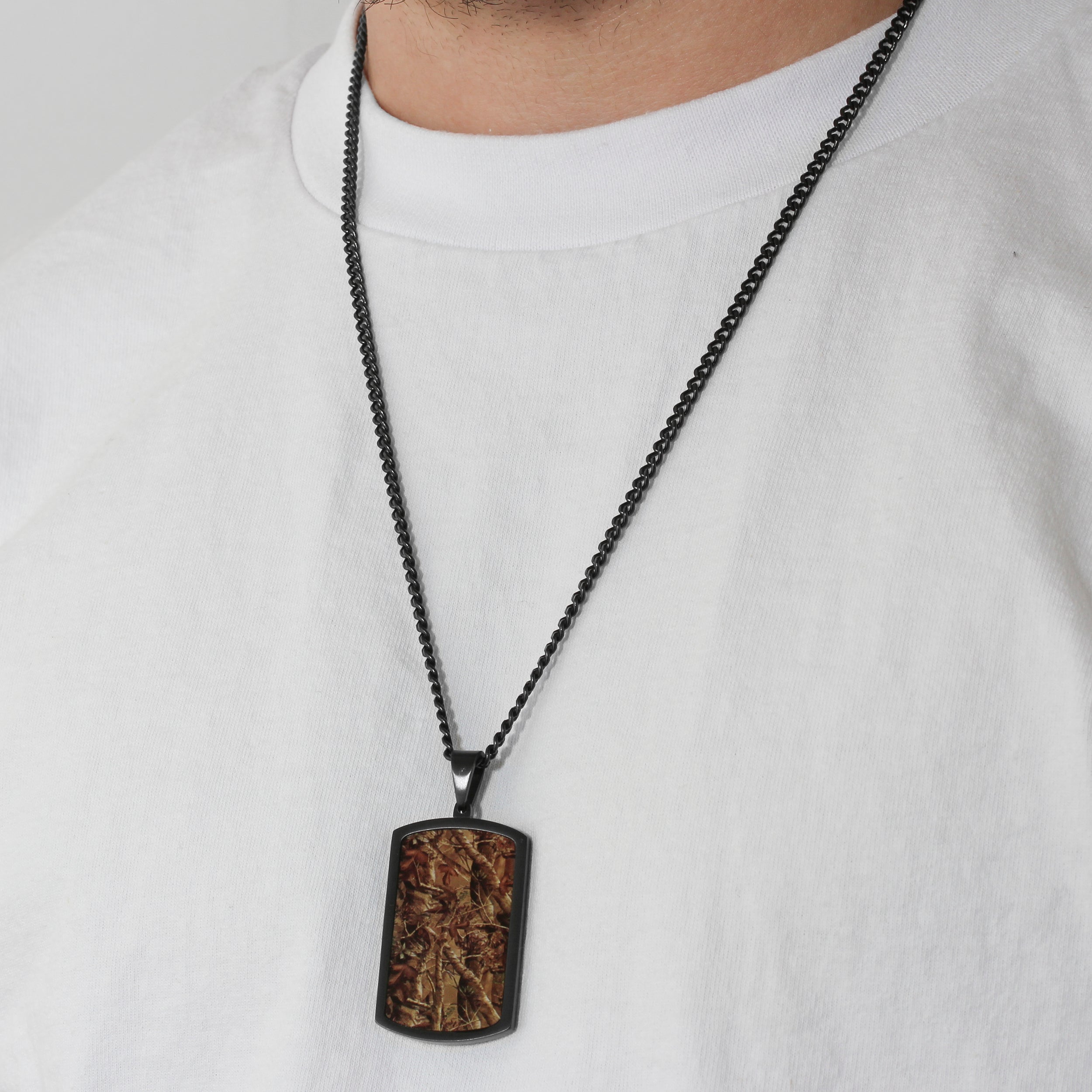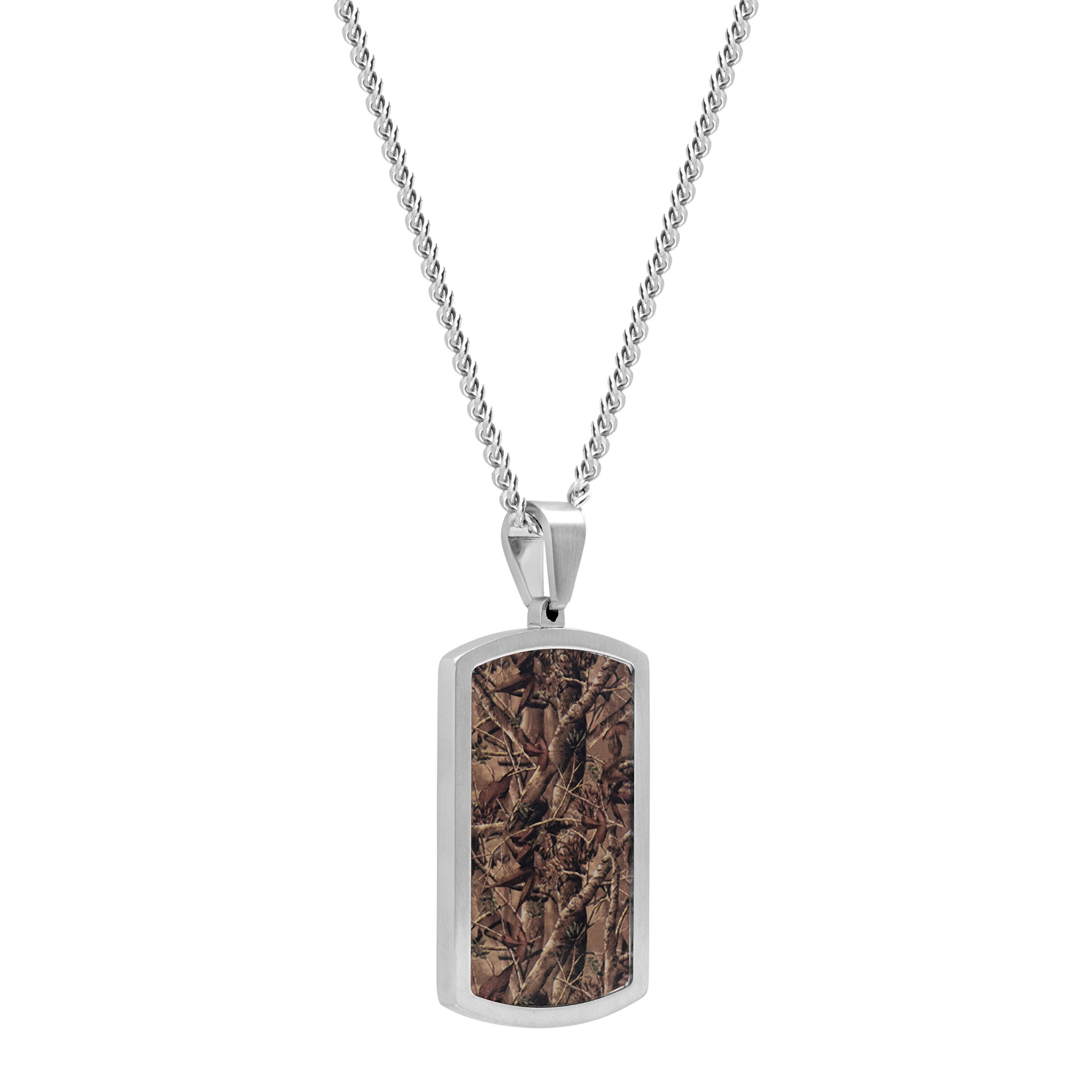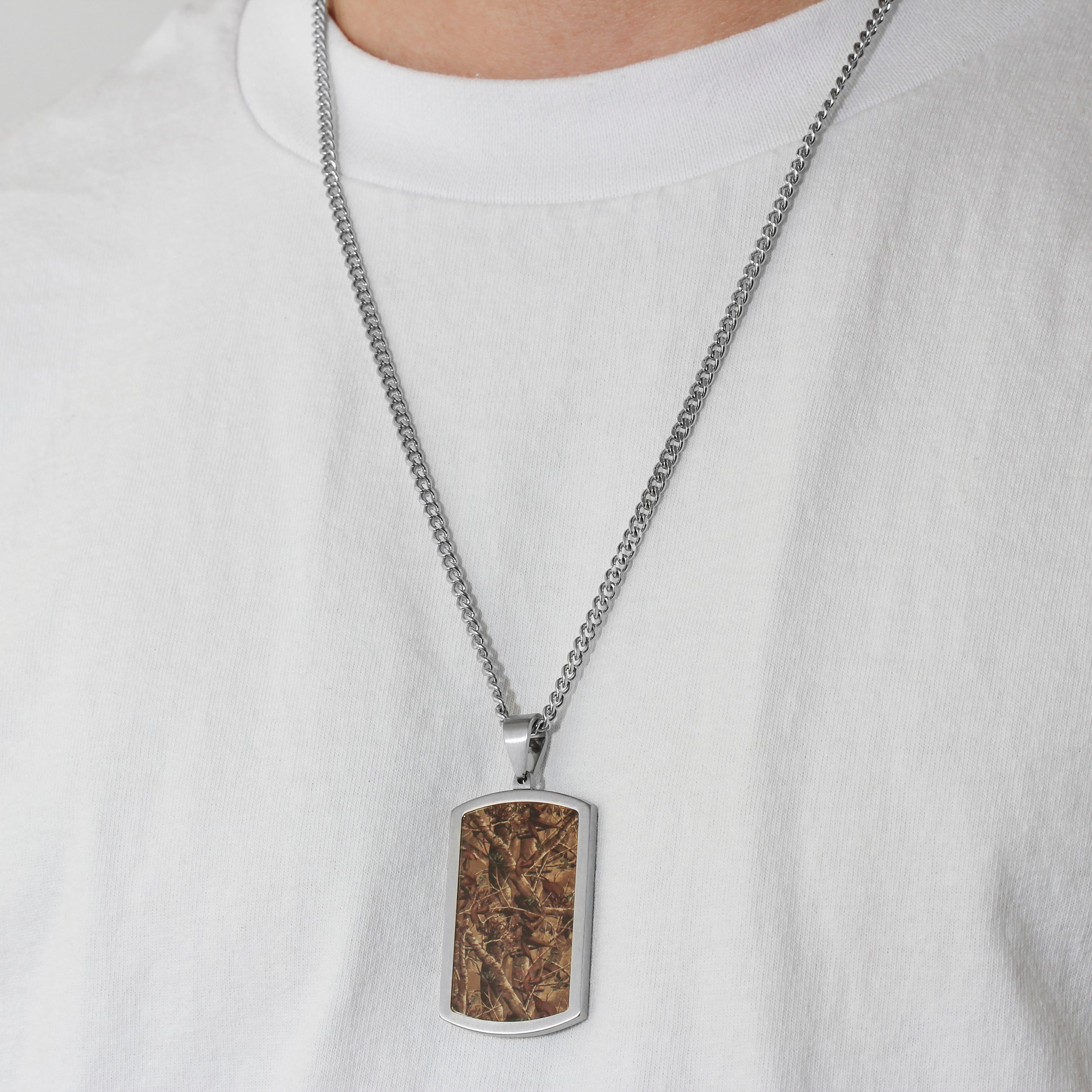 This men’s stainless steel camo dog tag pendant adds a rugged finish to everyday wear. The textured camouflage pattern catches light without flash, pairing clean edges with a solid, durable weight. Worn solo or layered, it delivers a strong utilitarian look.
