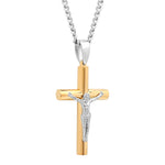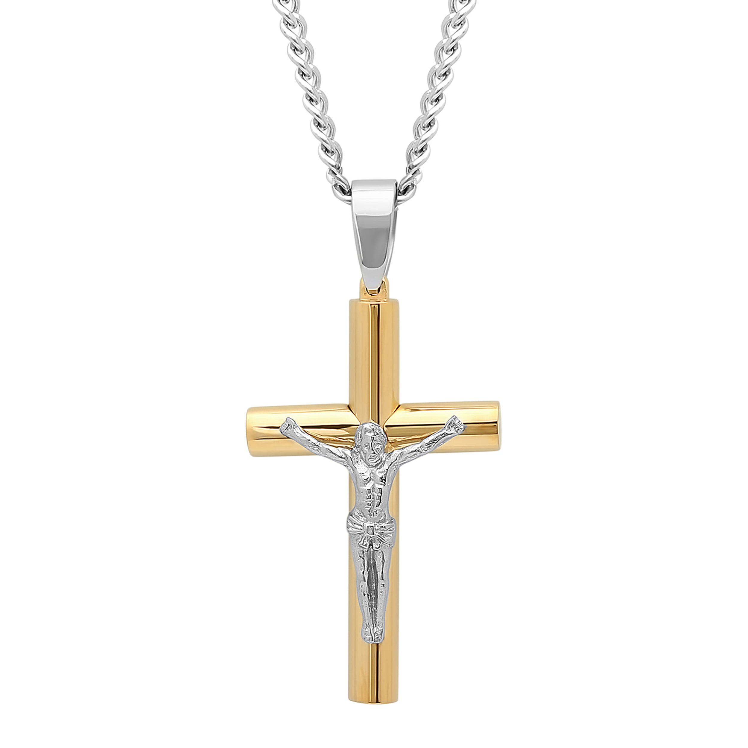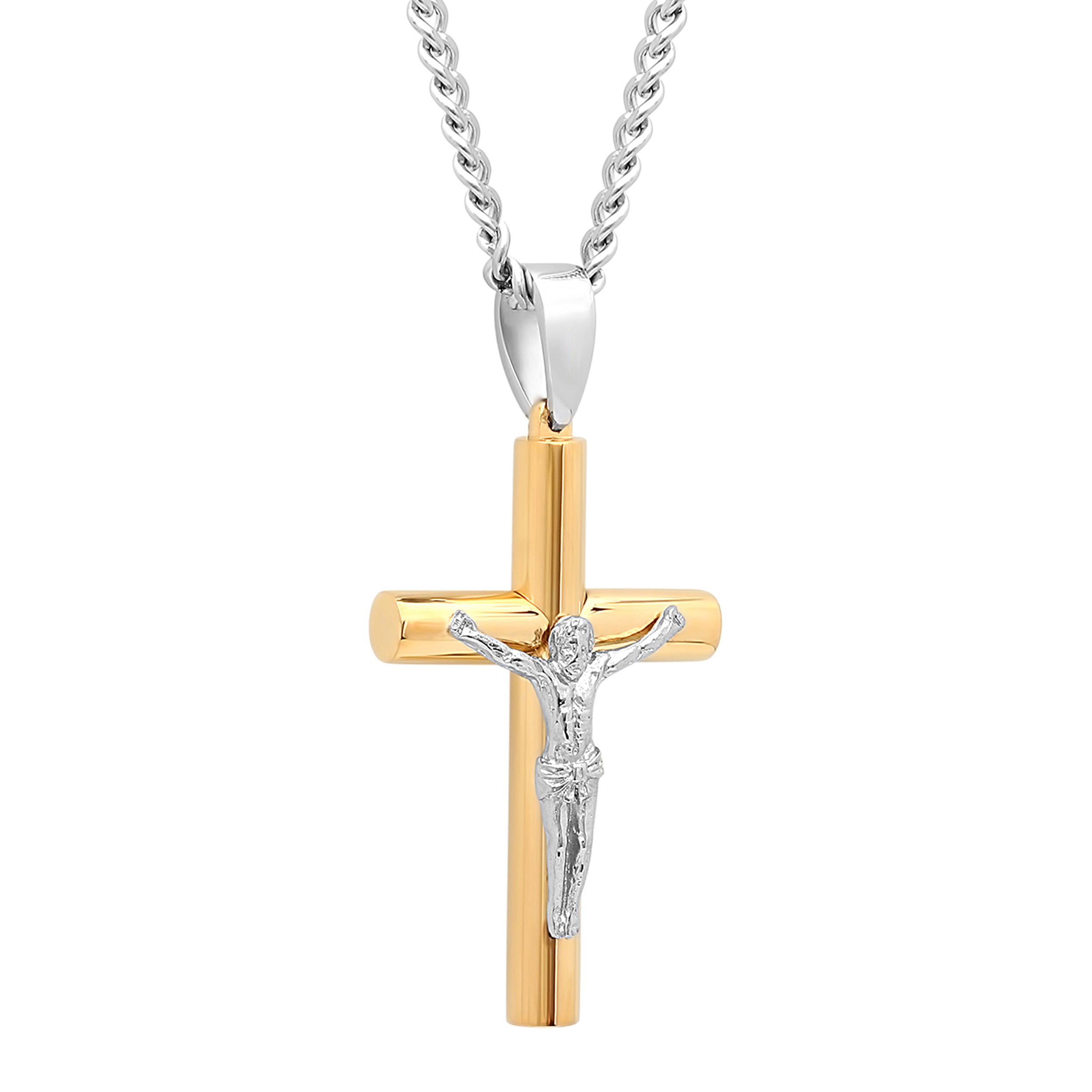 A men’s 100% stainless steel crucifix pendant crafted in a high-shine two-tone finish. The gold and silver contrast highlights every detail, giving this classic piece depth. A timeless design made for lasting wear and quiet symbolism.