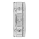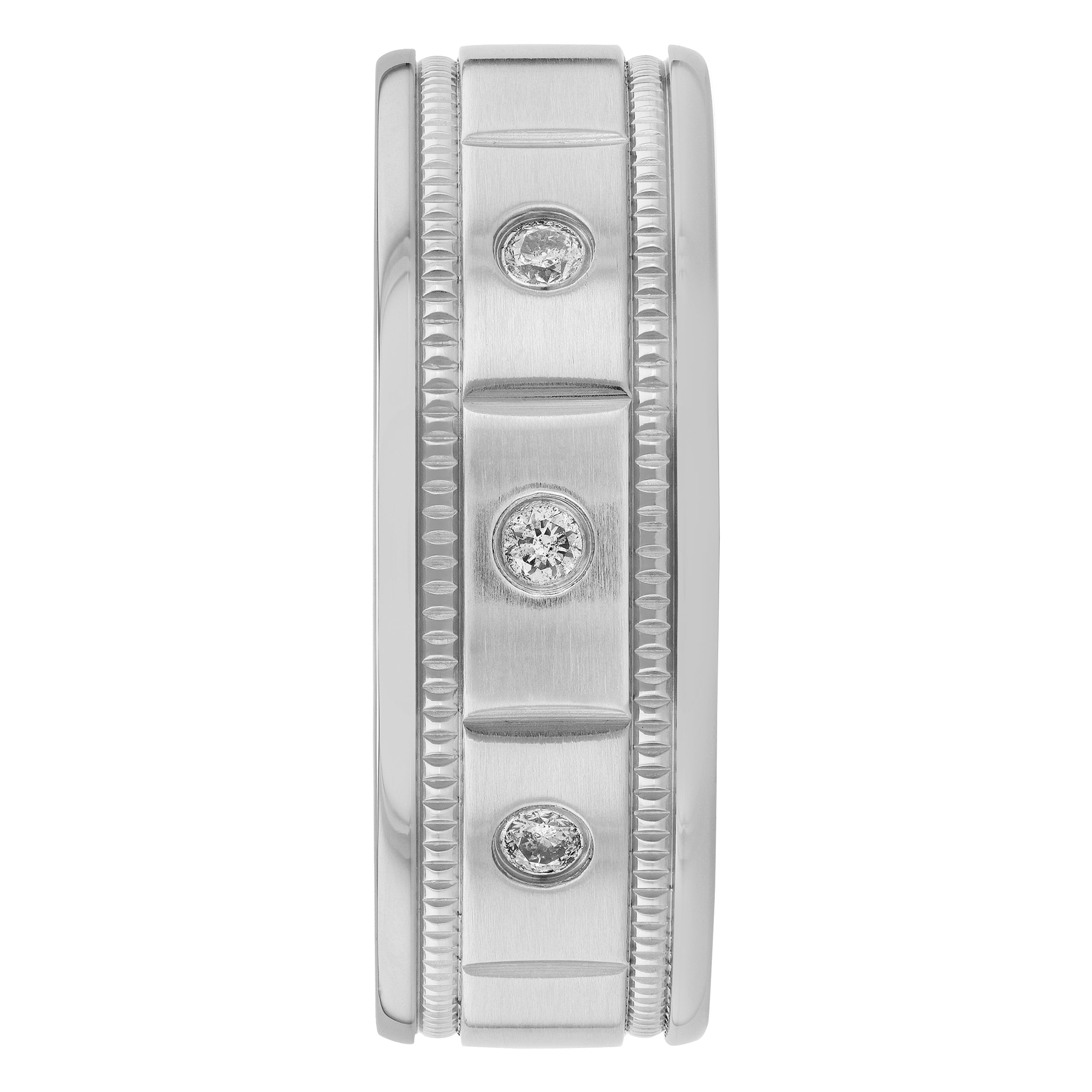 Bold and refined, these men’s stainless steel bands feature three round diamond accents set along a sleek brushed center framed by beaded edges. Designed with a comfort-fit interior and a polished finish, each ring delivers lasting durability and shine. Available in silver or black finishes, this modern design combines strength, sophistication, and everyday versatility.